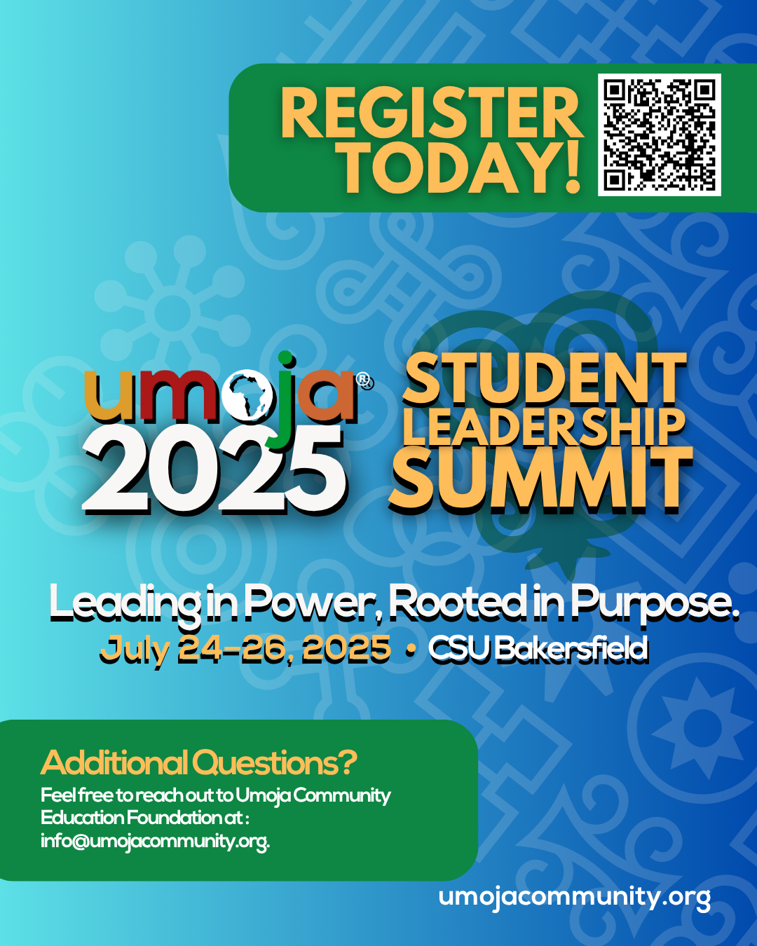 Student Leadership Summit: - In partnership with California State University, Bakersfield the Umoja Community Education Foundation is proud to host the 2025 Student Leadership Summit (SLS). We are excited to convene, train, and organize our student leaders to go forward to make great contributions to their local programs and the broader campus environment for African American students this coming academic year. The summit will provide historically and culturally grounded leadership training. - Registration will end July 12, 2025 5:00pm